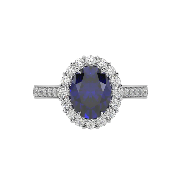 A luxurious oval cut Ceylon blue sapphire halo ring, accented with sparkling diamonds and crafted in premium 18K gold or platinum.